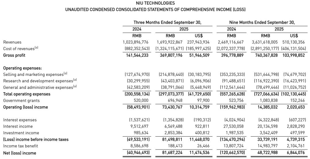 小牛电动2025年第三季度营收为16.939亿元,净利润为8170万元,2024年同期为净亏损4090万元。小牛电动已实现连续两个季度盈利。