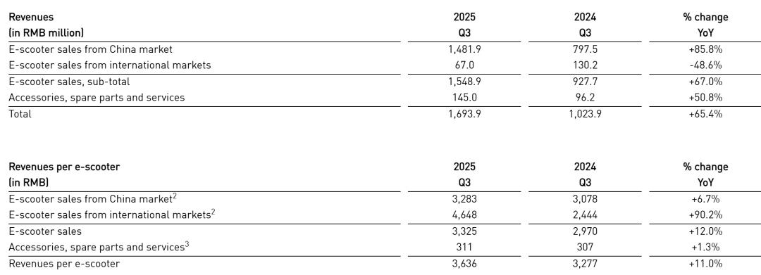 小牛电动2025年第三季度中国市场整车销售收入为14.819亿元,较上年同期的8亿元增长85.8%,占电动滑板车总收入的95.7%。增长主要得益于中国市场销量增长74.2%以及单车收入增长6.7%。