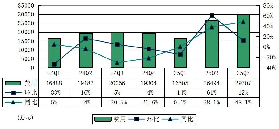 小牛电动2025年第三季度销售费用为2.149亿元(含股权激励费用120万元),较上年同期的1.277亿元增长68.3%,主要由于中国市场的销售推广支出增加7470万元。销售费用占营收比例为12.7%,上年同期为12.5%。