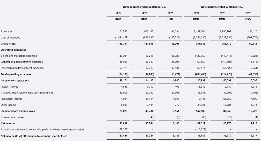 闪送2025年第三季度毛利为1.118亿元(约1570万美元),上年同期为1.3亿元;闪送2025年第三季度毛利率为11.1%,上年同期为11.3%。