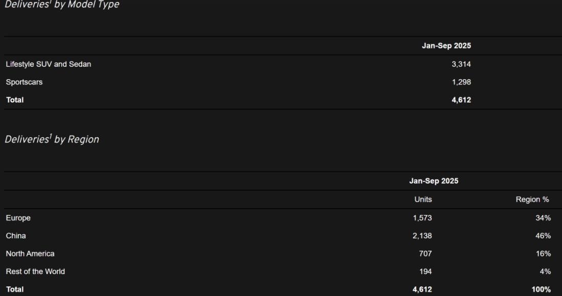 路特斯科技 (“Lotus Tech”)日前发布截至2025年9月30日的财报。财报显示,路特斯科技2025年前9个月营收为3.56亿美元,交付4612辆车,其中,路特斯科技2025年前9个月交付生活方式SUV和轿车3314辆,交付跑车1298辆。