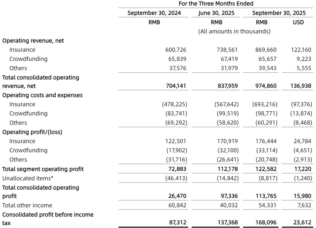 水滴公司2025年第三季度运营利润1.14亿元(约1600万美元),上年同期的运营利润为2650万元。水滴公司2025年第三季度运营利润率为11.7%。
