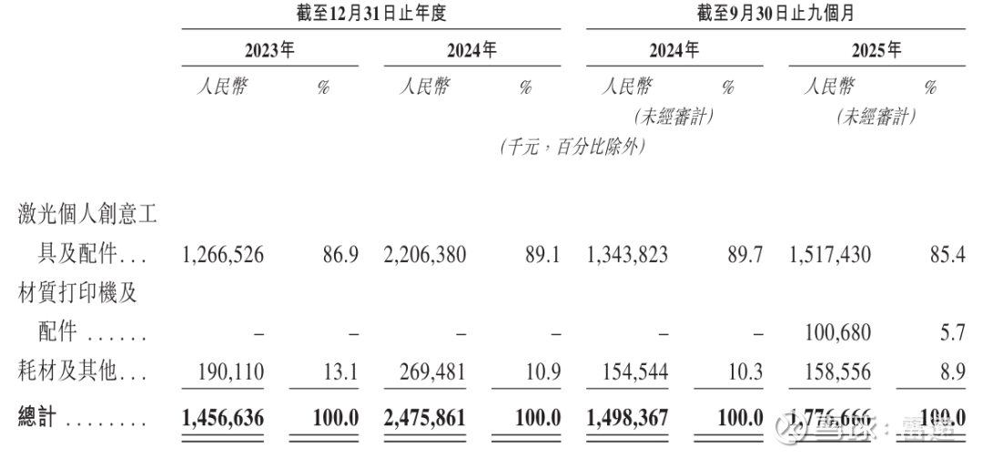xTool在2025年前9个月激光个人创意工具及配件收入为15.17亿元,占收入的比例为85.4%;材质打印机及配件收入为1亿元,占比为5.7%;来自耗材及其他收入为1.59亿,占比为8.9%。