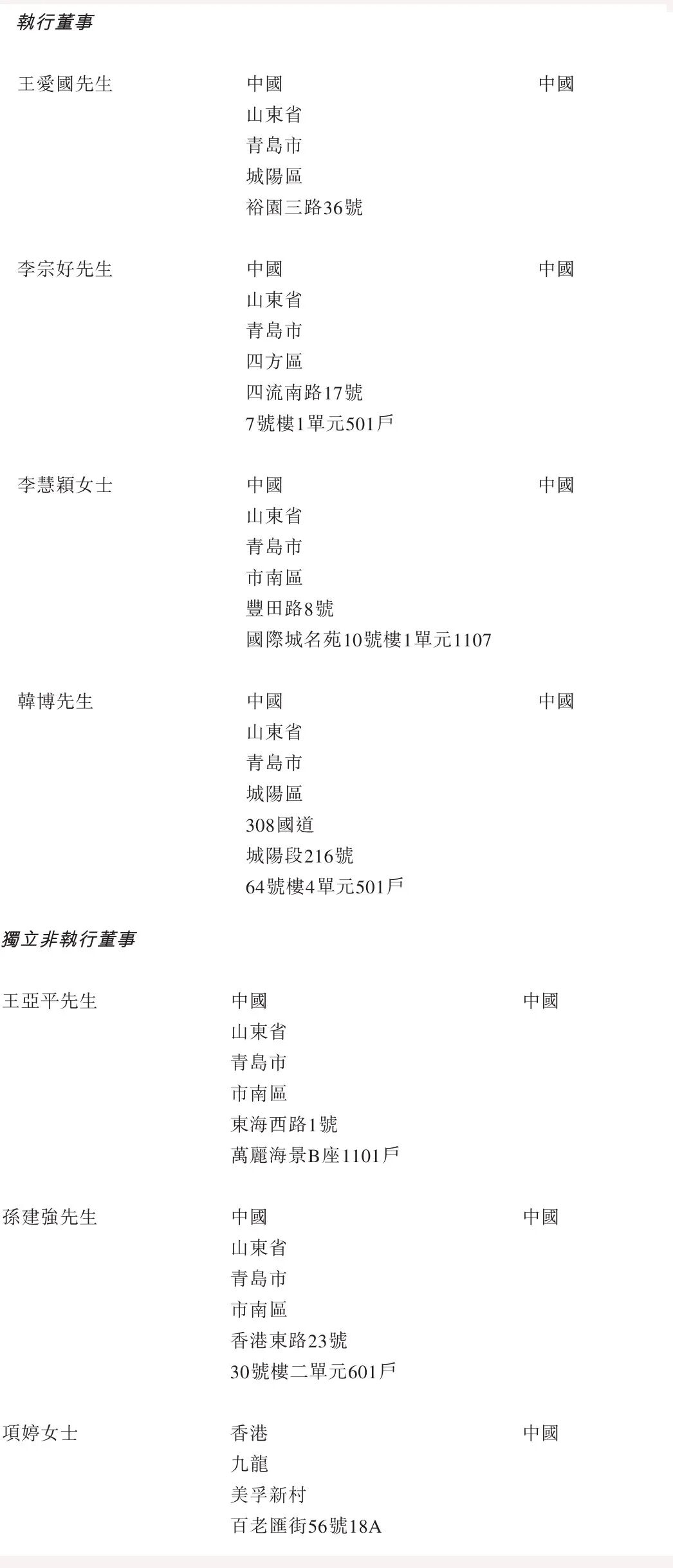 王爱国,56岁,于2000年创立集团,并于化工行业累积逾24年的经验。王爱国于2000年12月至2011年7月担任公司执行董事、总经理兼技术中心主任;于2011年7月起一直担任公司董事长、总经理兼技术中心主任。