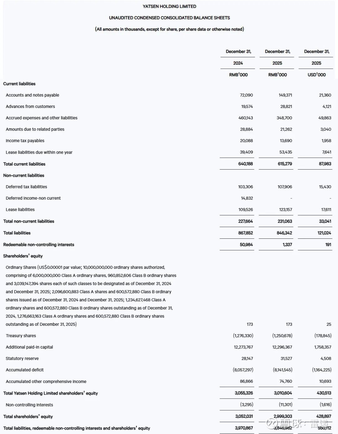截至2025年12月31日,逸仙电商现有负债为6.15亿元(约8798万美元),非流动负债为2.31亿元(约3304万美元),总负债为8.46亿元。
