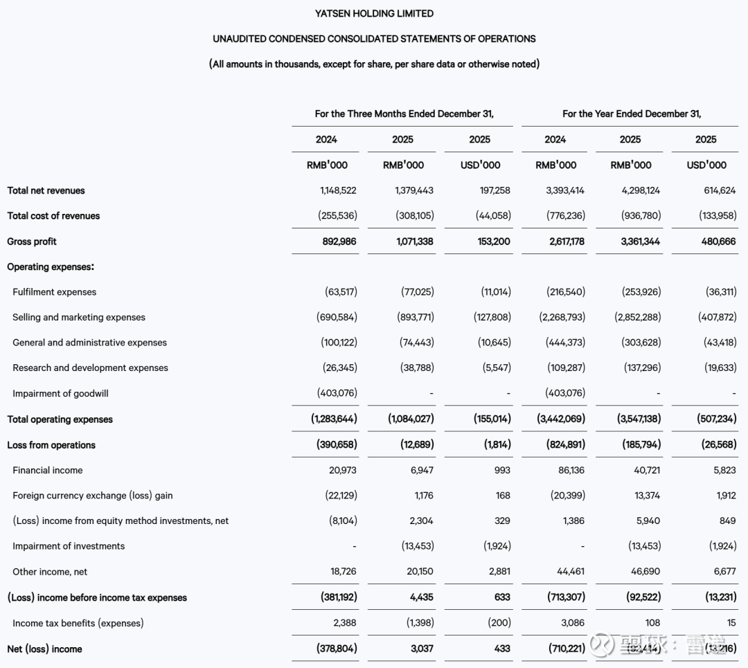 其中,逸仙电商2025年第四季度履约成本为7703万元,销售与市场费用为8.94亿元,管理费用为7444万元,研发费用为3879万元。逸仙电商上年同期有4亿元的商誉减值,这个季度并未此项开支。