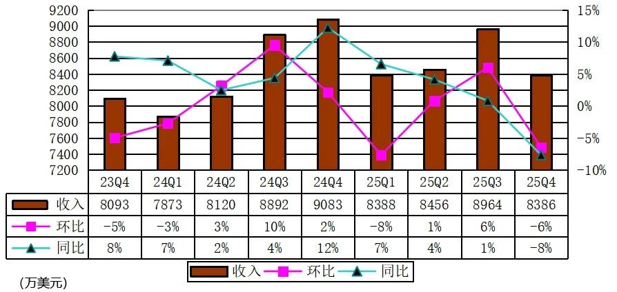 Yalla在2025年第四季度营收为8386万美元,较上年同期的9080万美元下降8%,较上一季度的8964万美元下降6%。