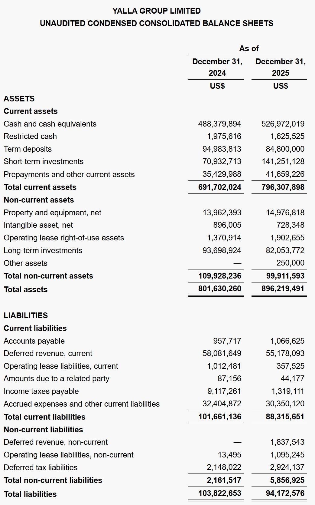 截至2025年12月31日,Yalla总资产为9亿美元,其中,流动资产为8亿美元,非流动资产为1亿美元;现有负债为942万美元,所有者权益为8亿美元。