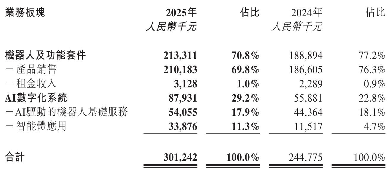 其中,云迹2025年来自机器人及功能套件收入为2.13亿元,上年同期的营收为1.89亿元,占营收的比例为70.8%;来自AI数字化系统收入为8793万元,占营收的比例为29.2%。上年同期为5588万元。