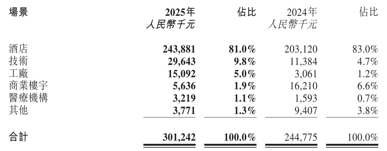 从场景来看,云迹的收入主要来自酒店,2025年来自酒店的收入为2.44亿元,占比为81%;第二大收入来自技术,为2964万元,占比为9.8%;来自工厂的收入为1509万元,占比为5%。