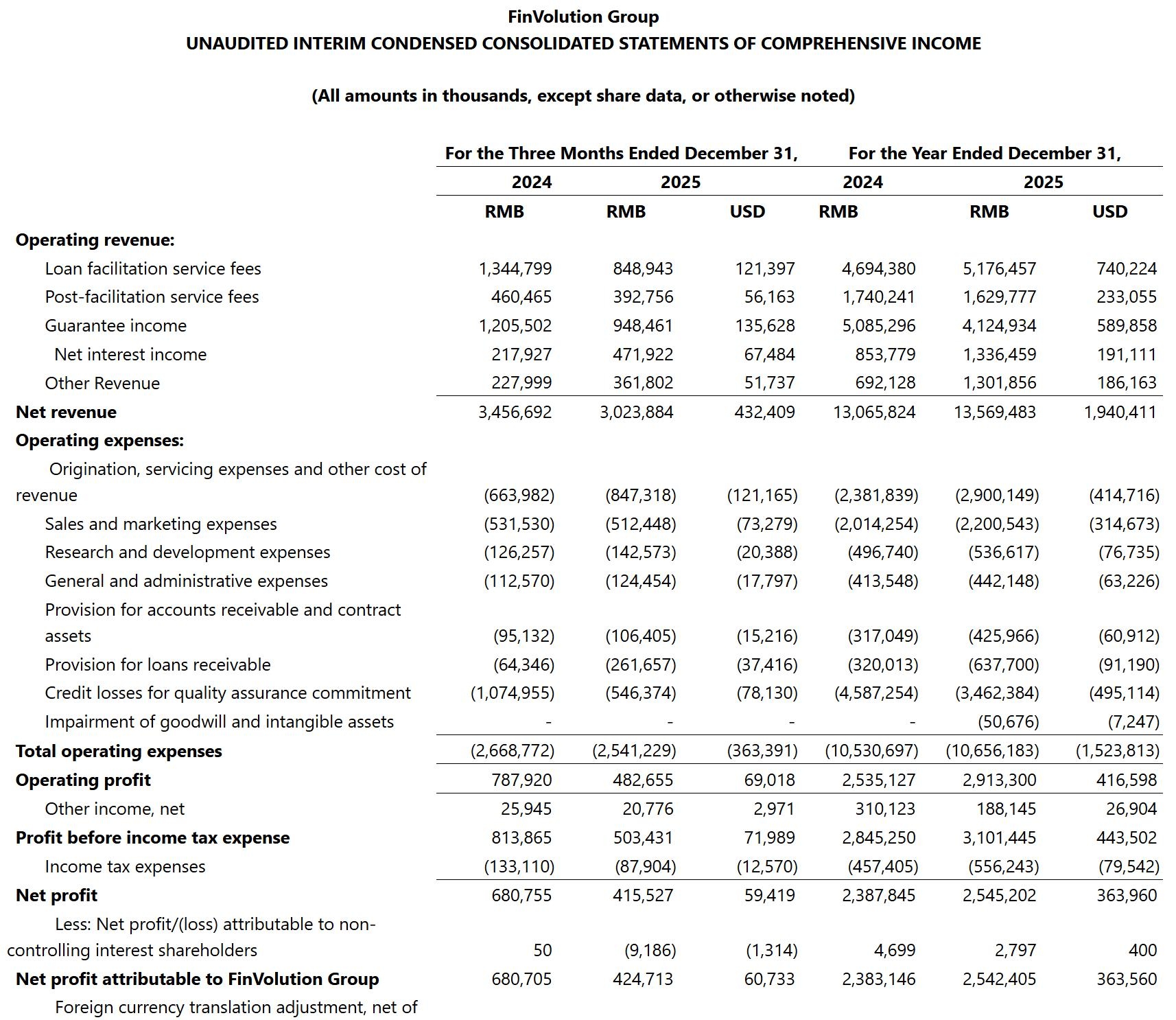 金融科技集团信也科技(NYSE: FINV)公布2025年全年及第四季度未经审计财务业绩。财报显示,信也科技2025年营收为135.69亿元(约19.4亿美元),较上年同期的130.66亿元增长3.8%。
