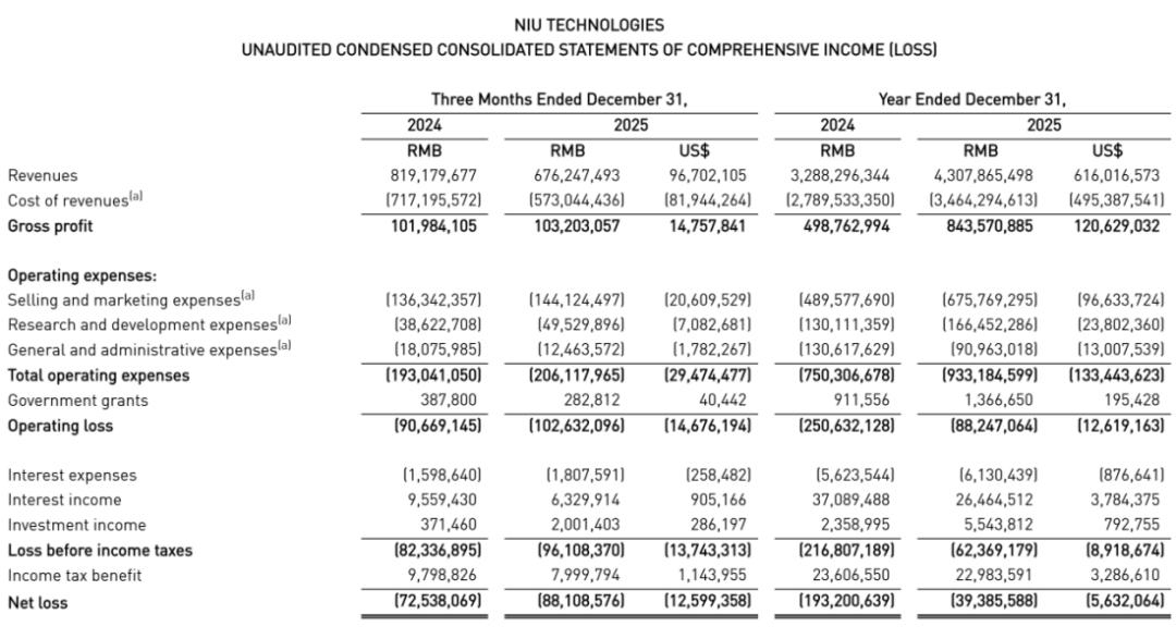 其中,小牛电动2025年第四季度销售与市场开支为1.44亿元,研发开支为4950万元,管理费用为1250万元。