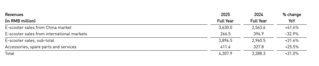 小牛电动2025年中国市场整车销售收入为36.3亿元,较上年同期的25.64亿元增长41.6%;国际市场整车销售收入为2.67亿元。
