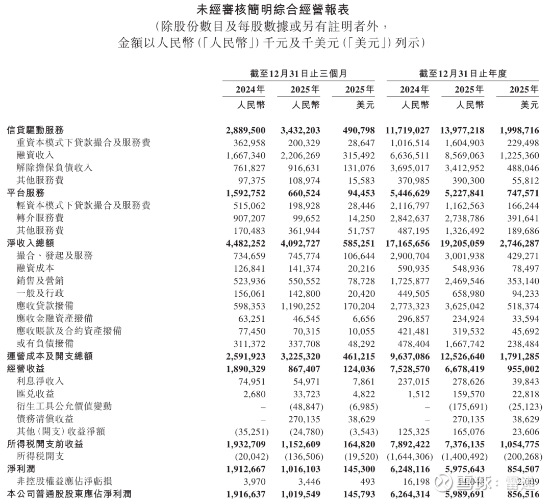 奇富科技2025年应占净利润为59.9亿元(8.57亿美元),2024年为62.64亿元;应占非公认会计准则净利润为63.68亿(