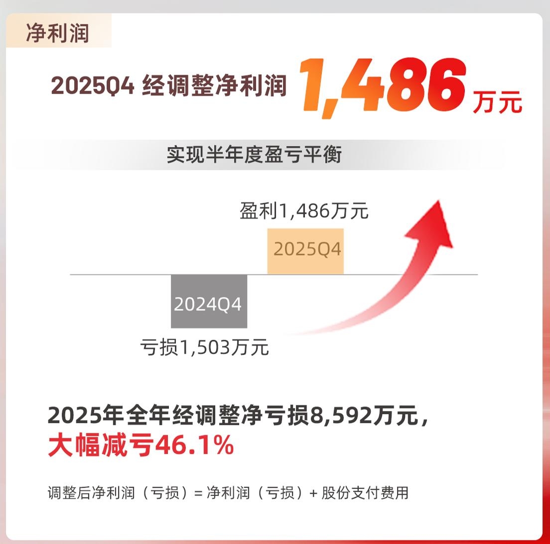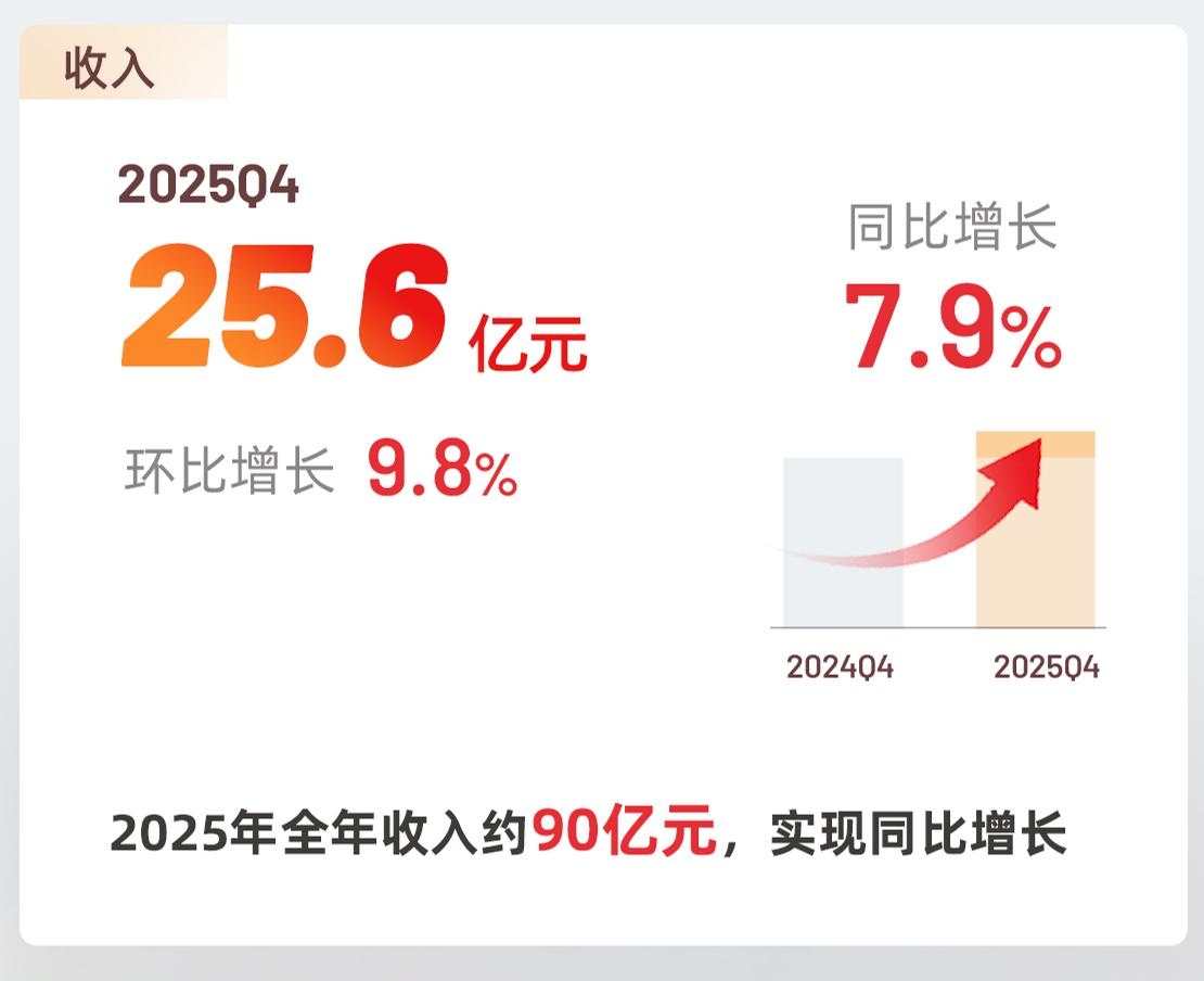 震坤行2025年第四季度营收为25.6亿元。财报显示,震坤行在“结构优化”“核心建设”“产品深耕”“技术驱动”等方面持续发力,经营表现自2025年下半年明显企稳回升:GMV与收入在第四季度实现正增长;盈利能力持续改善,公司第四季度实现经调整净利润1480万元,季度层面实现扭亏为盈,并实现半年度盈亏平衡。