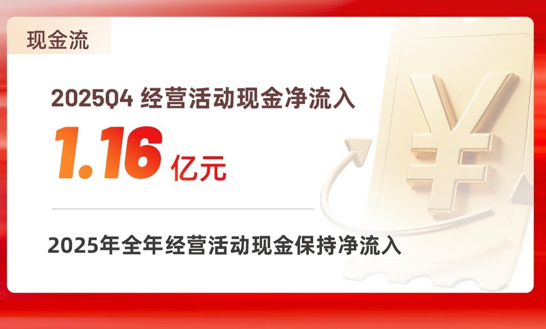 震坤行2025年第四季度经营活动现金净流入为1.16亿元,2025年全年经营活动现金保持净流入。