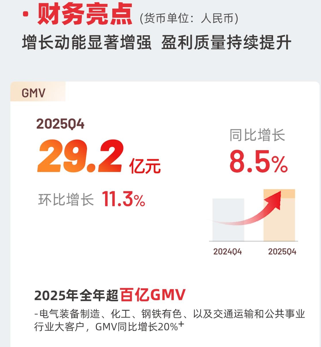 震坤行2025年第四季度GMV为29.2亿元,同比增长8.5%,环比增长约11%。公司表示,随着订单与发货趋势持续改善,预计2026年第一季度GMV同比增速将进一步提升至双位数。