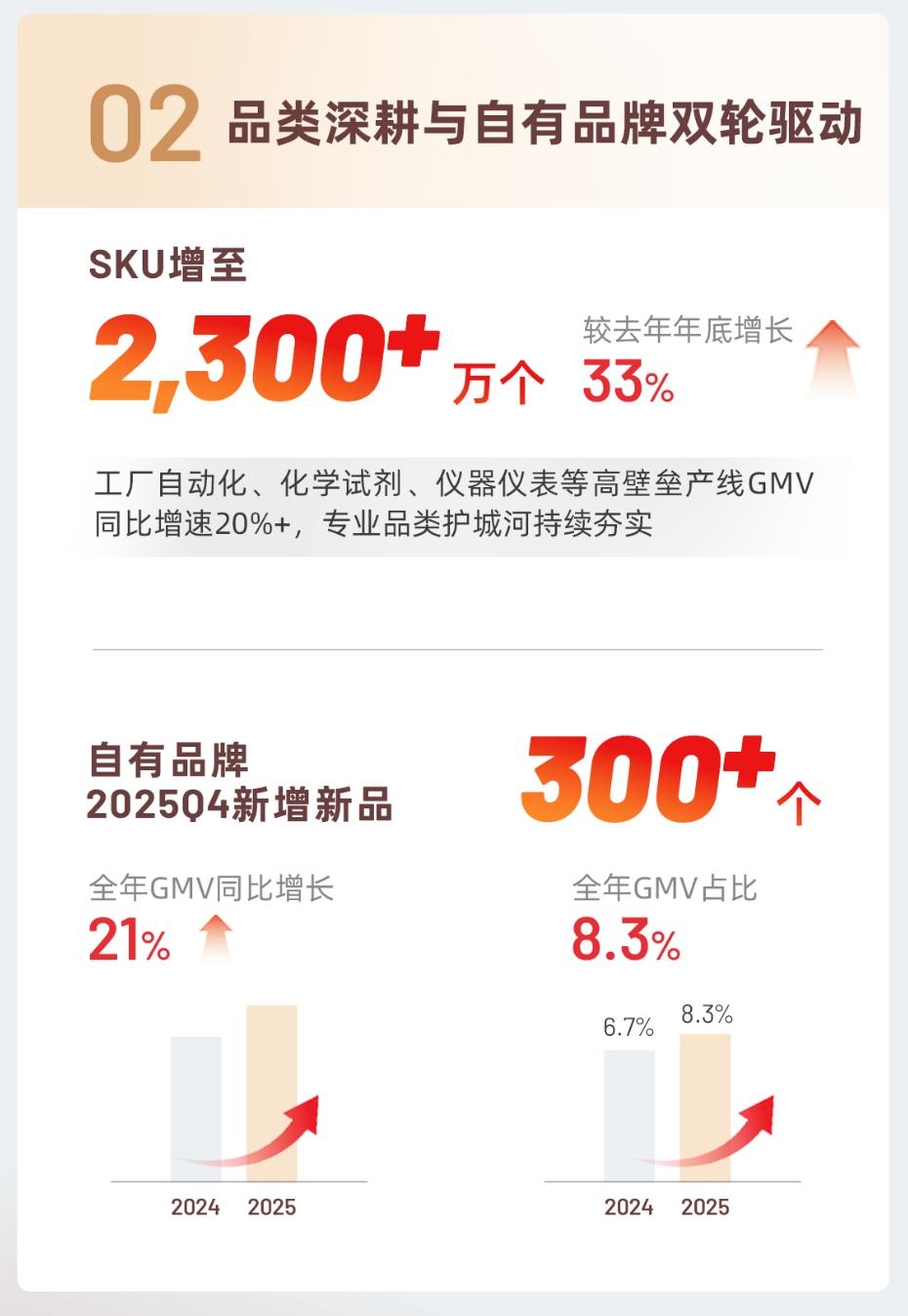 截至2025年底,平台SKU数量已达到2300万,同比增长33%,新增商品主要集中在工厂自动化、化学试剂、仪器仪表等专业硬核工业用品领域。四季度,传动设备、仪器仪表和化学试剂等多个专业品类GMV同比增速均超过20%,专业供给能力“护城河”进一步巩固。