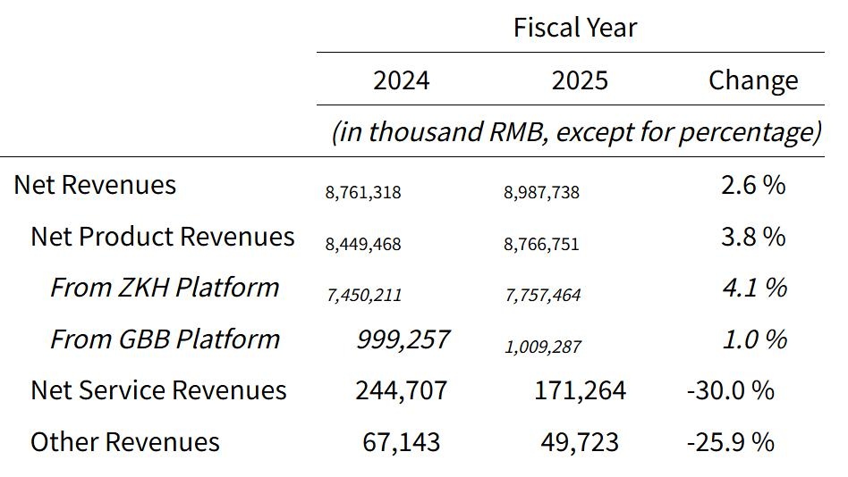 震坤行2025年第四季度来自ZKH Platform收入为22.19亿元,较上年同期的20.5亿元增长8.3%;GBB Platform收入为2.75亿元,较上年同期的2.54亿元增长8.1%;净服务收入为4970万元,较上年同期的5123万元下降3%。