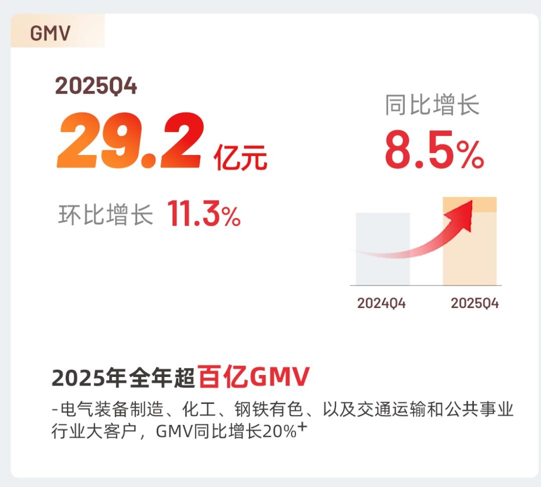 震坤行2025年第四季度GMV为29.2亿元,同比增长8.5%,环比增长约11%。公司表示,随着订单与发货趋势持续改善,预计2026年第一季度GMV同比增速将进一步提升至双位数。