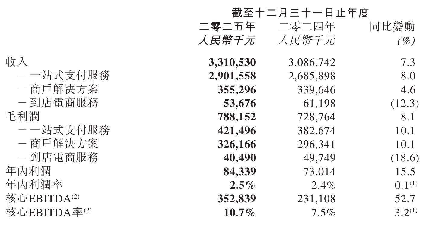 移卡2025年年内利润为8434万元,较上年同期的7301万元增长15.5%;年内利润率为2.5%,较上年同期的2.4%提升了0.1个百分点。