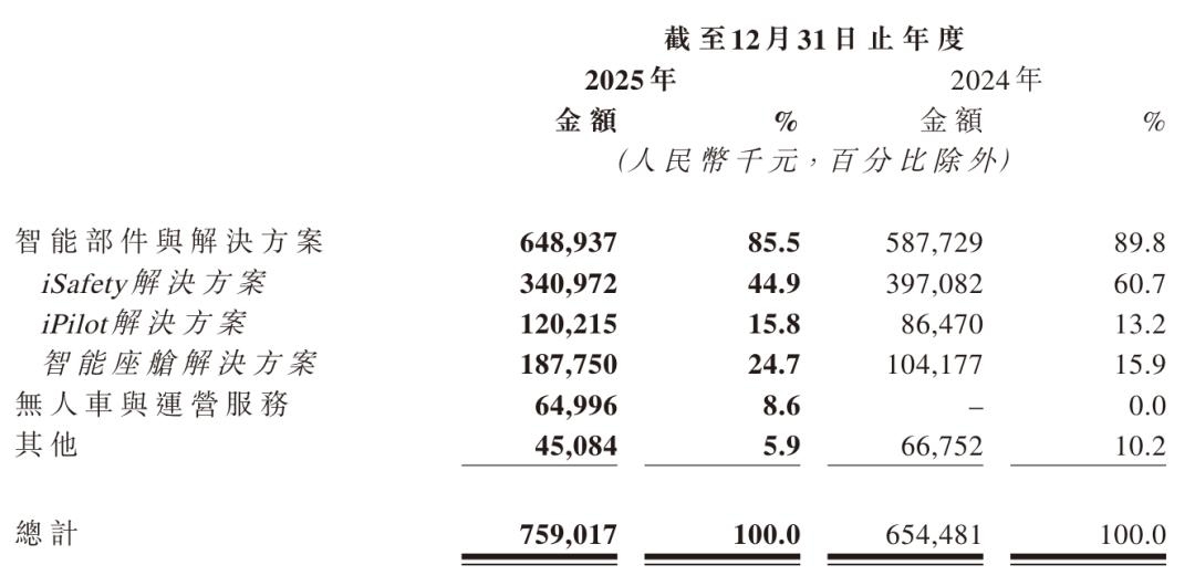 佑驾创新2025年智能部件与解决方案业务收入为6.49亿元,占总收入比重约85.5%。其中,iSafety智能辅助驾驶收入为3.41亿元,较上年同期的4亿元下降25%;iPilot中高阶辅助驾驶收入为1.20亿元,同比增长39.0%;