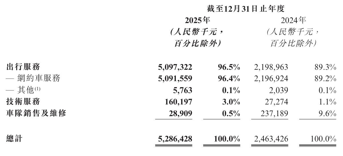 如祺出行收入主要来自网约车服务,2025年来自网约车的收入为50.92亿元,占比为96.4%。