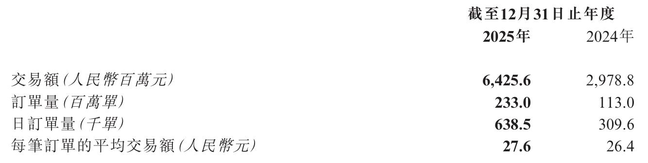 如祺出行2025年的交易额为64.26亿元,订单量为2.33亿单,日订单量为6.39万单,每单订单的平均交易额为27.6元。
