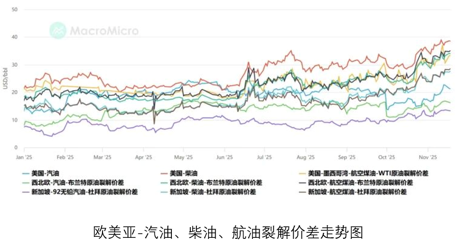俄罗斯炼油产能锐减直接推高了海外成品油裂解价差。数据显示,2025年11月中旬以来,海外成品油裂解价差呈全线飙升态势,柴油领涨各类油品,衡量炼油利润的核心指标3-2-1裂解价差创近两年新高,炼油行业迎来高盈利周期。11月18日,全球3-2-1裂解价差触及$32.13/桶,为2024年3月以来最高水平,较10月均值上涨超30%,反映全球炼油利润显著增厚。