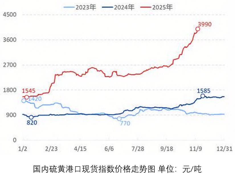 国内硫黄港口现货指数价格在10月中下旬起进入加速上涨,11月中下旬最高报至3990元/吨,逼近4000元大关,近一个多月涨幅超1000元/吨,较年初暴涨约2500元/吨。