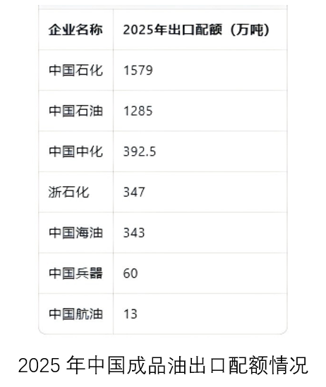 从企业资质看,中国成品油出口仍以国企为主导,中国石化(1579万吨)、中国石油(1285万吨)占据成品油出口市场主要份额。其中,荣盛石化是目前国内唯一具备成品油出口资质的民营炼化企业,其旗下子公司浙石化2025年获得成品油出口配额347万吨。