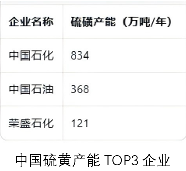 据统计,国内硫黄总产能约1680万吨/年,产能分布呈现高度集中特征,中国石化、中国石油和荣盛石化是国内硫黄产能TOP3企业,分别拥有834万吨、368万吨和121万吨产能,合计占据全国70%以上的市场份额。
