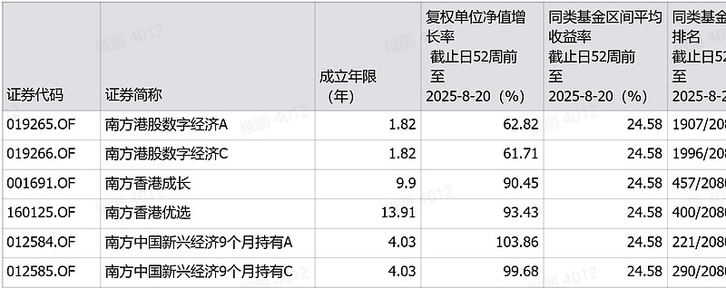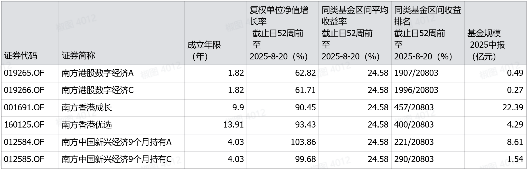 熊潇雅目前一共管理着4只基金,均为主要投资港股市场的基金,业绩表现非常亮眼。在过去52周内(截至8月20日),“南方中国新兴经济9个月持有”净值涨幅超过100%;规模最大的“南方香港成长”净值涨幅超过90%;“南方香港优选”和“南方港股数字经济”净值分别上涨94%和63%。