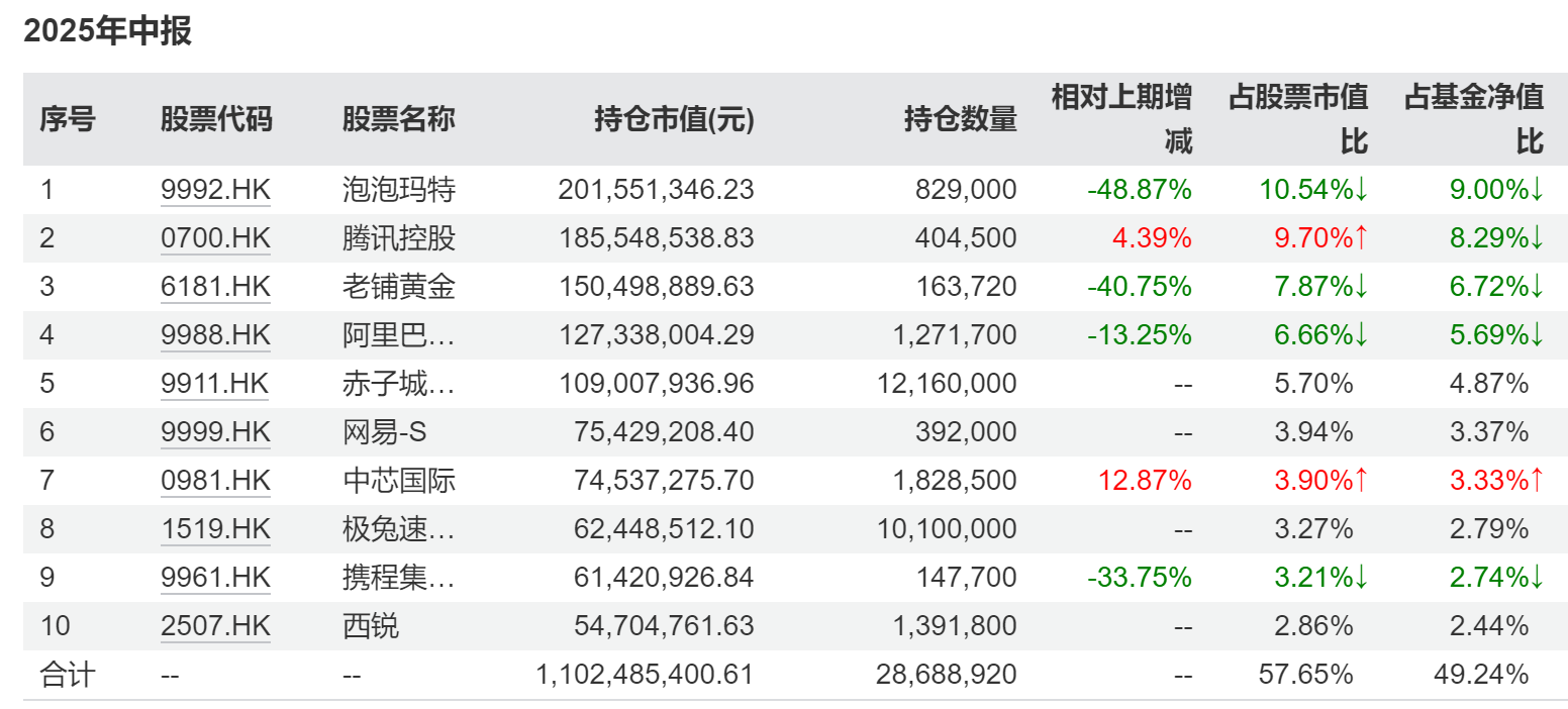 表2.南方香港成长2025年中报前十大重仓股名单,数据来源:Wind