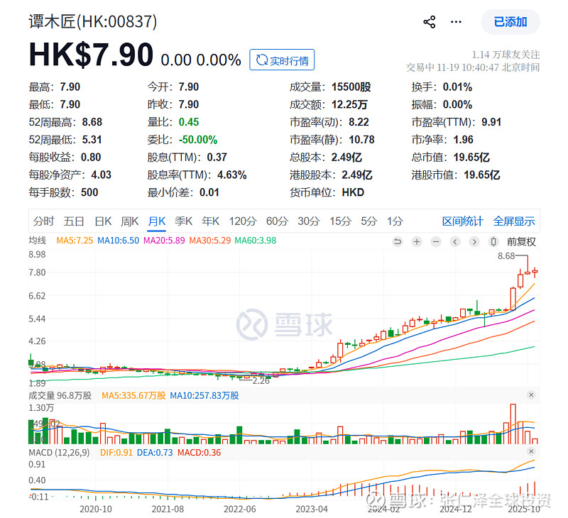 四,杨天南最早持股谭木匠的时间是 2018 年 12 月底,从创始人谭传华处买入 200 万股,成本约 5 港元 / 股。杨天南在谭木匠上的年化收益率(含现金分红)约为 13.25%,其中股价增值贡献约 62.7%,现金分红贡献约 37.3%。这个长期收益是相当不错的。但是我们看看谭木匠的月K线图,仅仅是2019年到2023年初这段时间,就可以看到公司股价基本没啥收益,我不知道长期持股的杨天南究竟感受如何。事实上谭木匠是一家相当不错的公司,没有有息负债,估值不高,每年都会稳定的分红。就是这个现金分红贡献了相当大的收益。$谭木匠(00837)$