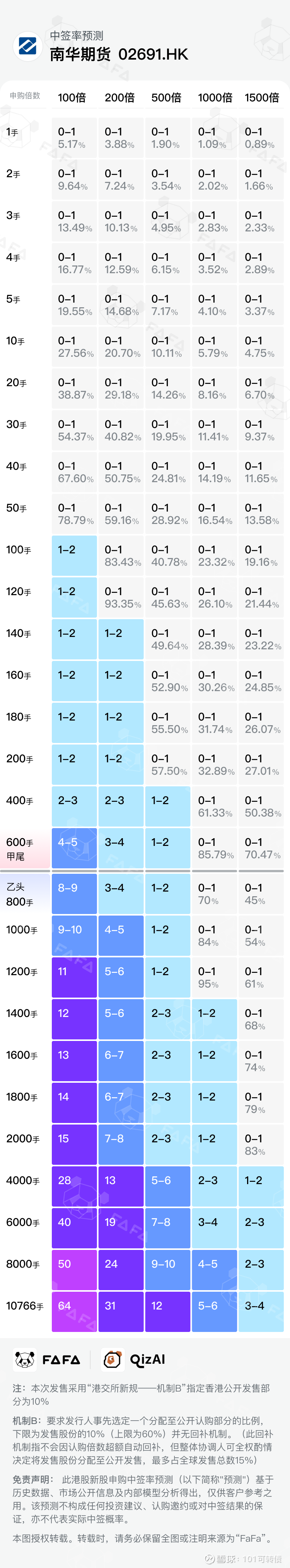 南华期货股份采用机制B,回拨10%;全球发售1.08亿股,香港发售1076.60万股,一手是500股,共计21532手,甲乙组各10766手;甲尾申购需要49万本金,乙头申购需要65万本金;现在热度很低,跟印象大红袍、明基医院、华芢生物-B、轻松健康、翰思艾泰-B、诺比侃资金都冲突,会分散资金安排;预计最终应该是在10倍左右。由中信独家保荐,无基石,有绿鞋,历史保荐项目很不错。