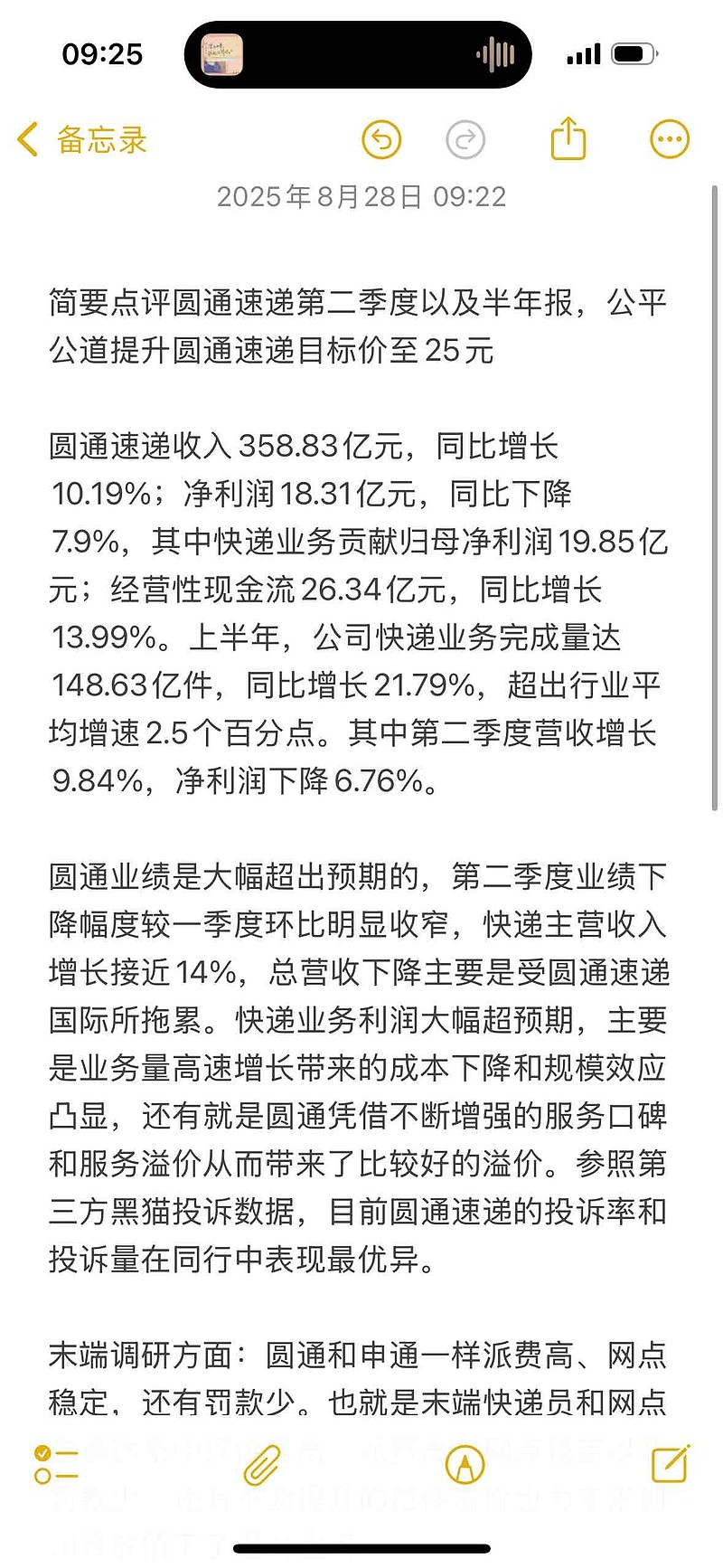 简要点评圆通速递第二季度以及半年报,公平公道提升圆通速递目标价至25元