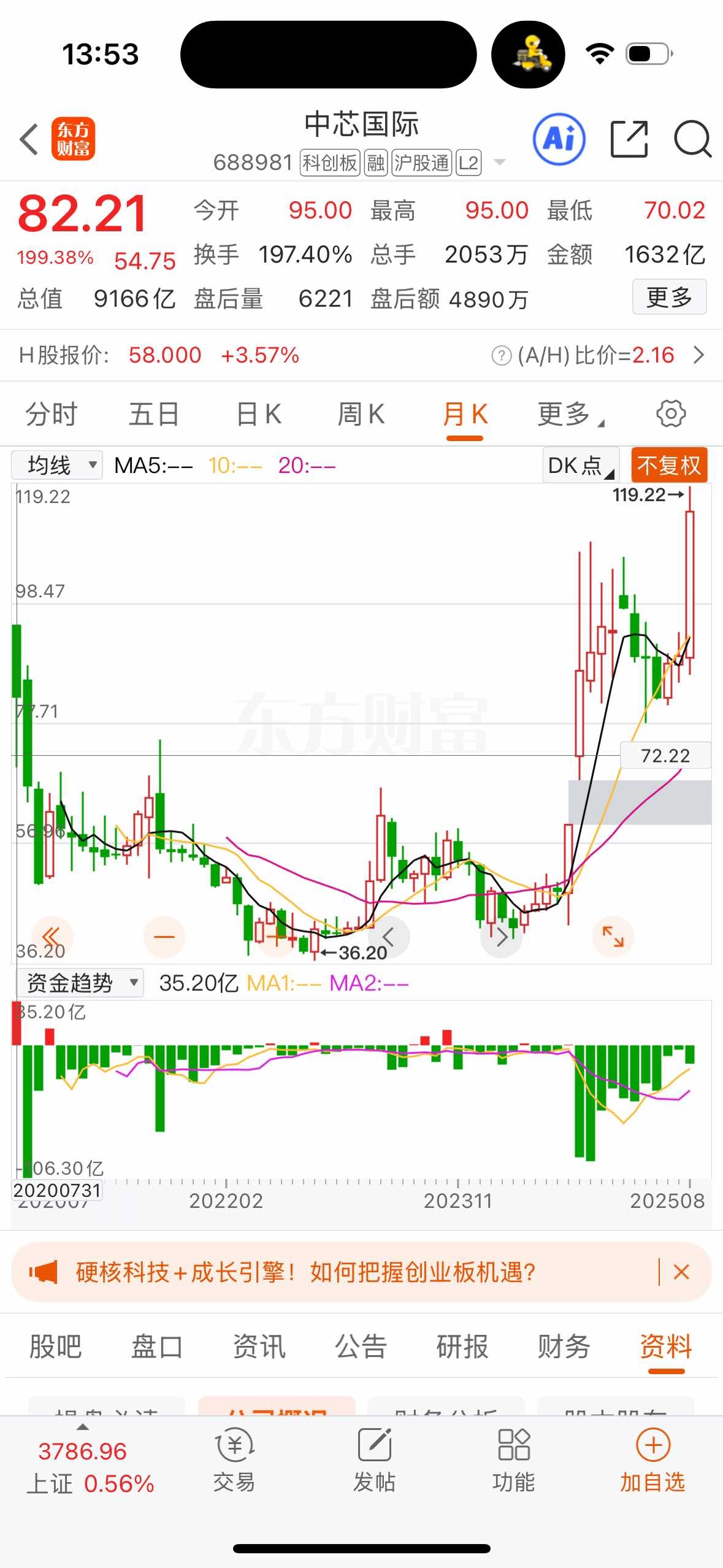 3.估值提升效果,中芯国际港股4300亿元人民币,A股市值是9166亿元,也就是A股估值是港股2.13倍。中芯国际发行价27.46元,上市后一个月最高95元,最大收益是扣除本金还赚2.46倍。而且中芯国际港股在A股上市前几个月一直上涨。也就是上市钱炒作,上市后也炒作。