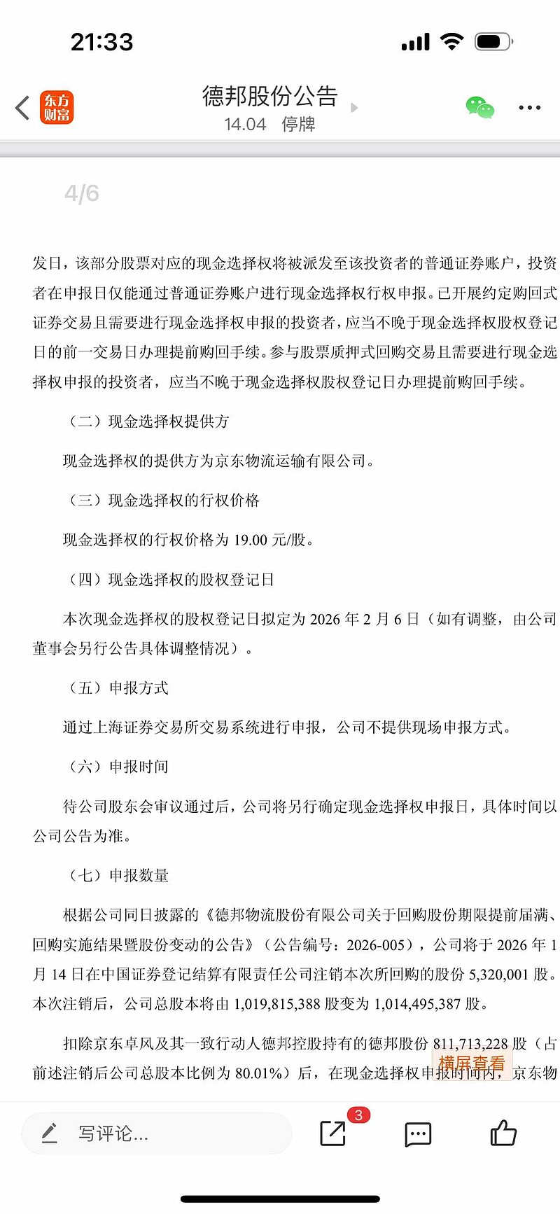 $德邦股份(SH603056)$ 哎,德邦还是选择了19元1股私有化退市,1%的概率还是出现了。虽然两个账户都没亏,也就赚十几个点吧!我个人目前准备拿到最后私有化的时候,反正保底是19元,看看有没有资金炒作把股价炒高一点。但是我个人又不投诉了,因为京东也有溢价了,也算还可以了。也就是顺其自然最低拿19元,有资金炒作就拿到20几元。因为坚持了差不多7个月,说实话虽然按照私有化价格没亏,但是也不赚啥钱。所以也有一点点不舍得把。