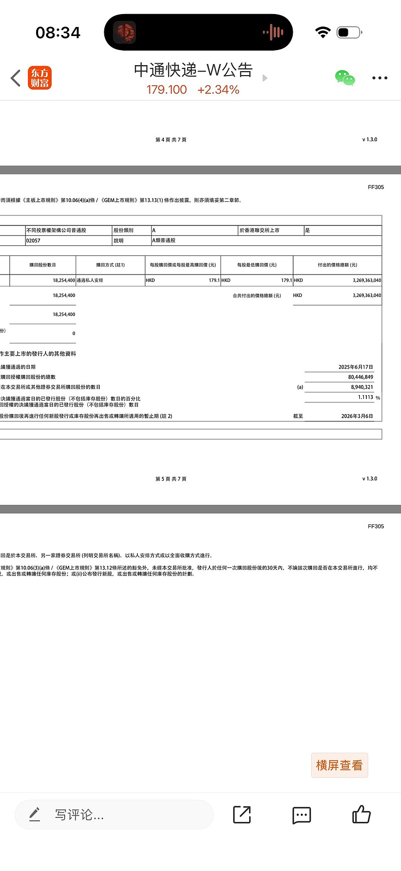 3.中通快递于2月4日回购32.69亿元,回购价格179.1元,回购方式私人安排。
