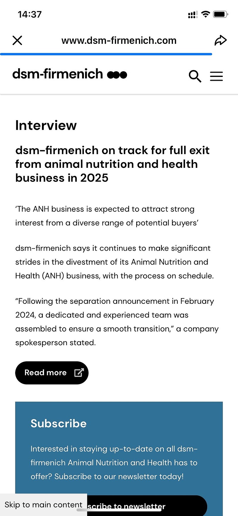 帝斯曼-芬美意表示,其在剥离动物营养与健康(ANH)业务方面持续取得重大进展,流程正按计划推进。