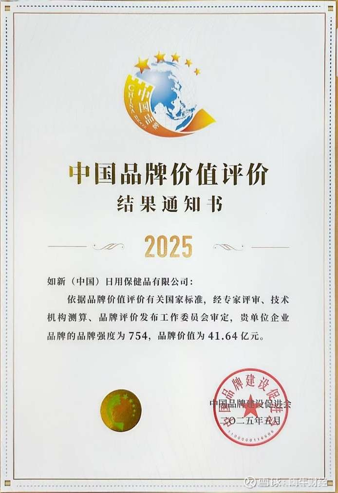中国品牌建设促进会发布的如新(中国)2025年“中国品牌价值评价”证书