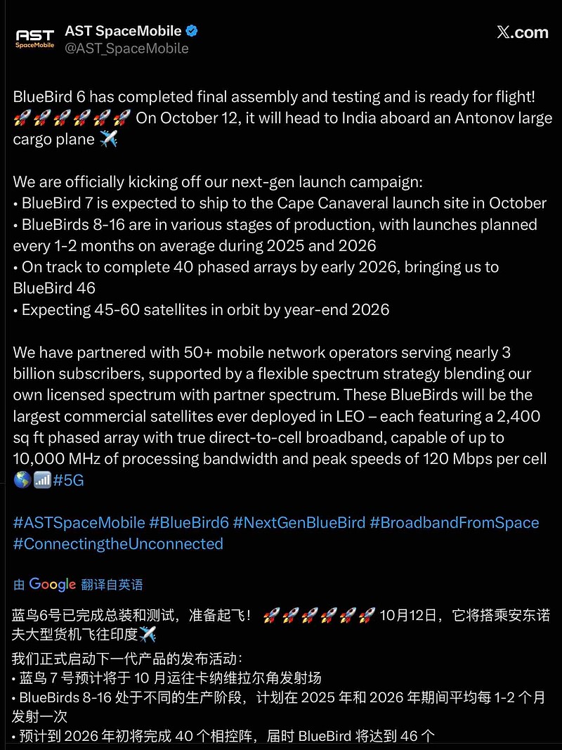 $AST SpaceMobile(ASTS)$ 官方公布BB6是10月12号空运到印度(根据之前合同应该是ISRO负责发射),没有说预计什么时候发射。BB7预计10月运输到Cape Canaveral(SpaceX发射场)。预计发射日期没公布。如果照历史经验,BB7会不会比BB6还要早上天。