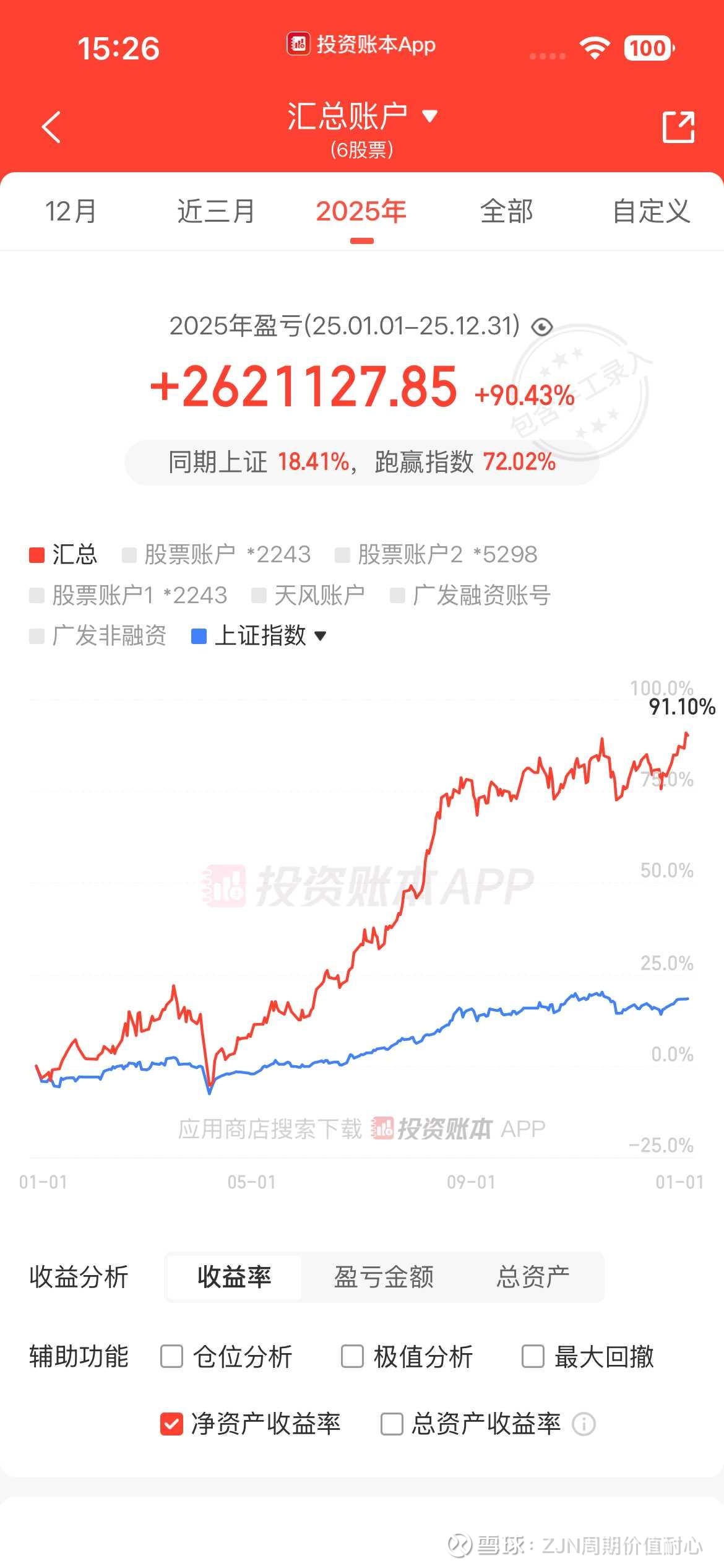2025年基本收在全年最高点,全年盈利327.7万(手动精确记账),收益率翻倍有余,其中股票收益262万(软件统计),期货账户假期登不进去了,大概是65万左右,收益率没法算,软件统计五六倍,主要第一次炒期货,初始资金投入少但又涨的猛,平均两三倍应该是有的。$建滔集团(00148)$ $东岳集团(00189)$ $神火股份(SZ000933)$