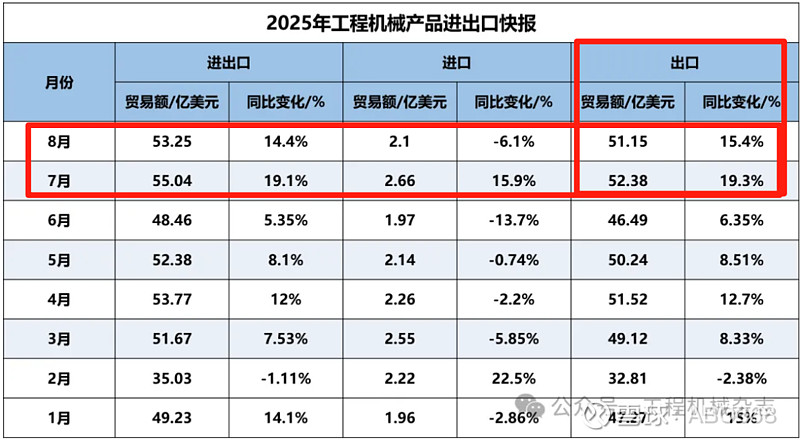 2、国外营收三季度增速进一步提速:预计中联重科三季度国外估计同比增长30%,工程机械行业出口7、8月增速提速至15%-20%(见下图),相比上半年个位数增长明显提速。主要是发展中国家(如非洲、拉美、中东、东南亚)对基建、矿采(如金矿、金属矿)需求旺盛;加上欧美市场从下半年开始呈现复苏迹象,采购需求逐步恢复。