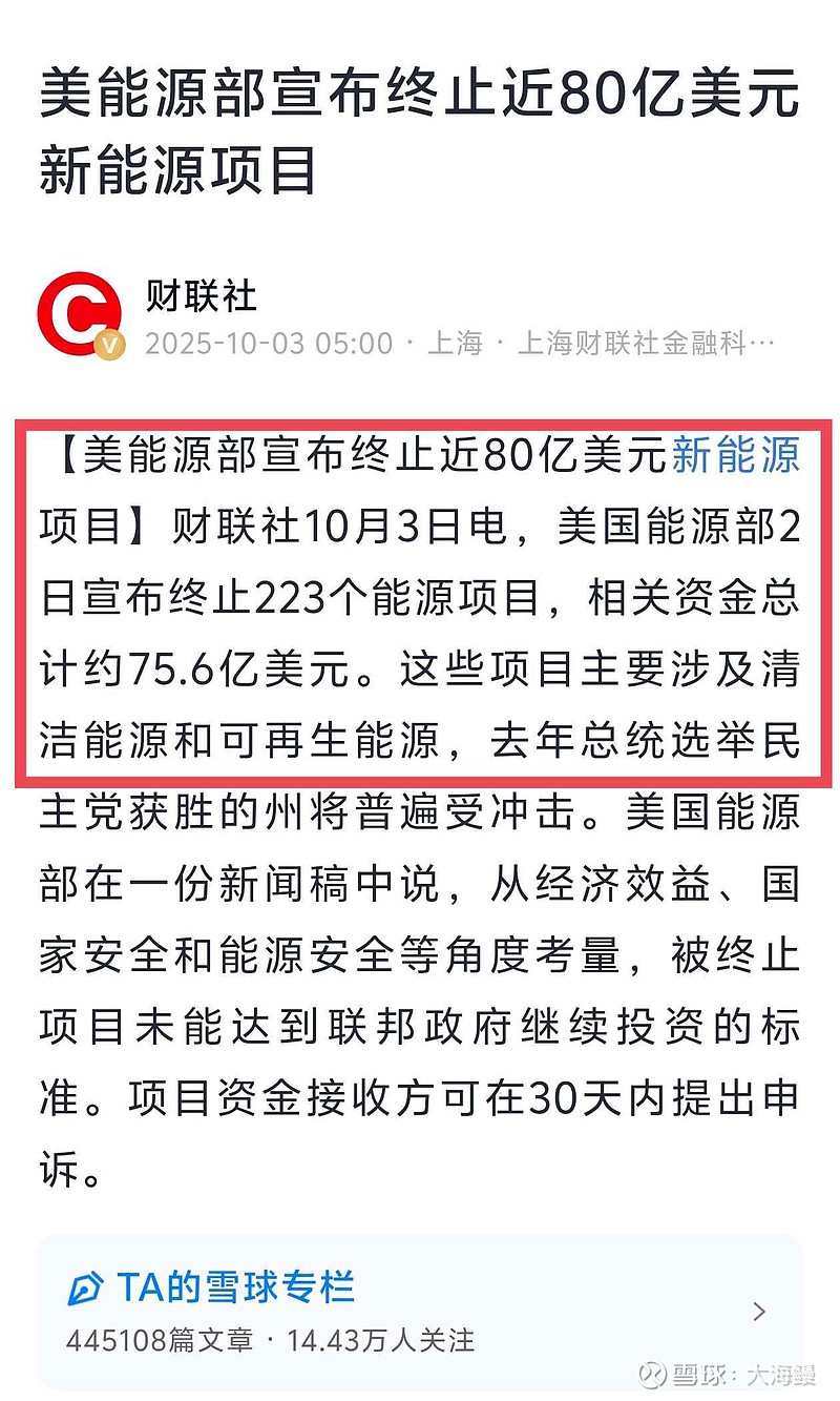 “财联社10月3日电,美国能源部2日宣布终止223个能源项目,相关资金总计约75.6亿美元。这些项目主要涉及【清洁能源和可再生能源】。”