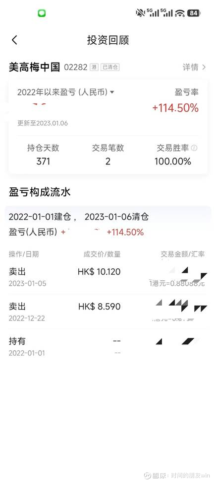 由于2020年口罩的冲击,澳门博彩业股价暴跌,因为当时我从长线价值投资及终局思维的角度思考,坚定认为口罩事件一定会过去,所以2021年下半年我花了大量的时间去研究澳门菠菜业,还亲自去了好几趟澳门实地蹲点考察,最终决定买入澳门菠菜业的股票,从6家菠菜股中选中了美高梅中国,下图是我证券账户的买卖记录,盈利还行,挣了114.5%,翻了一番。
