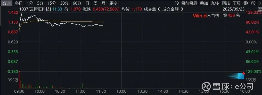 港股云智汇科技昨日早间暴涨134%后紧急停牌,今日复牌继续大幅高开高走,盘中一度飙升逾129%,两个交易日最高合计大涨逾435%。