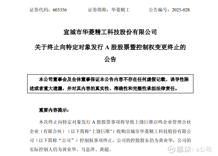 9月26日晚间,华菱精工发布公告,综合考虑当前资本市场环境情况变化、公司发展规划等诸多因素,经相关各方充分沟通、审慎分析后,决定终止向上饶巨准启鸣企业管理合伙企业(有限合伙)(以下简称“上饶巨准”)发行A股股票事项。而伴随着前述定增事项终止,上饶巨准收购公司控制权也同步告终,公司控股股东仍为黄业华,实控人仍为黄业华、马息萍、黄超。