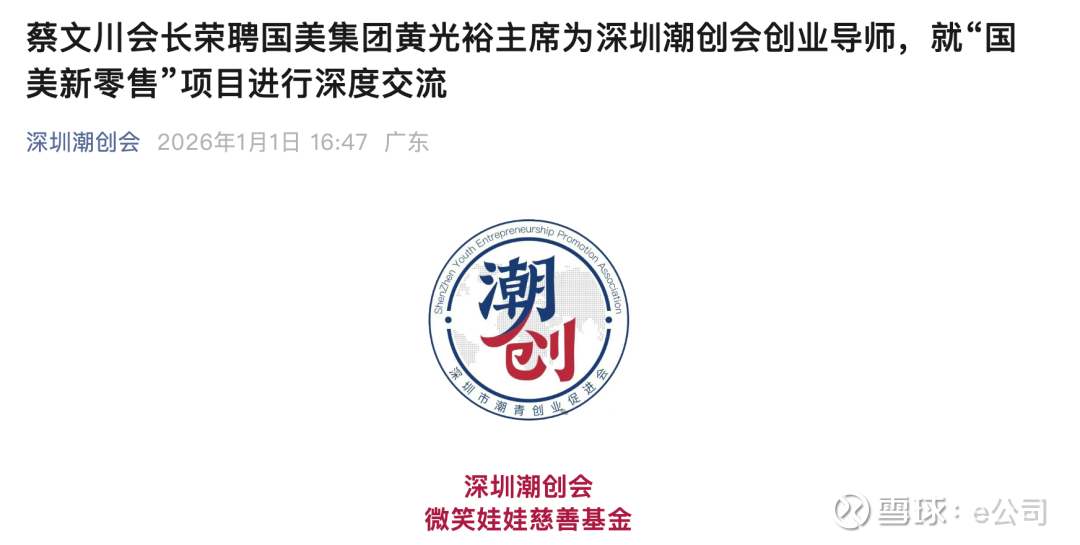 证券时报·e公司记者注意到,深圳潮创会(由马化腾担任荣誉会长)微信公众号1月1日发文称,深圳潮创会会长蔡文川一行到访国美集团,与国美集团主席黄光裕座谈;同时,蔡文川聘任黄光裕为深圳潮创会创业导师。